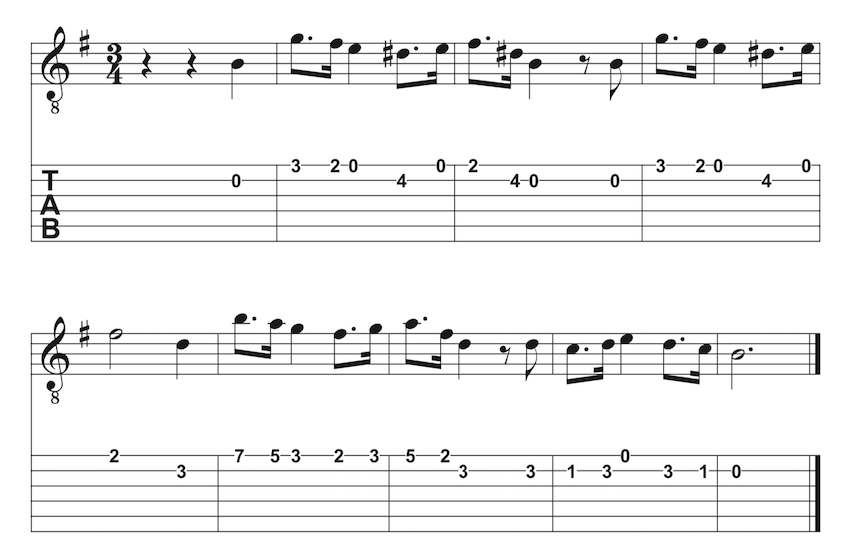 Un simple arpège "Pim" : vous jouez le pouce sur la basse, l'index sur la 2ème corde et le majeur sur la première.