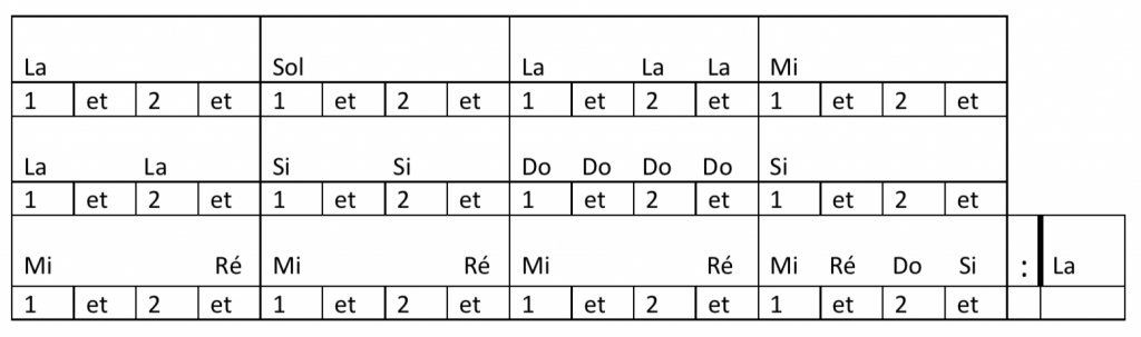 Chaque ligne correspond à 4 mesures. On termine toujours par le mot "vent" à la fin et par la note "La" (soit la basse, soit l'accord de La mineur).