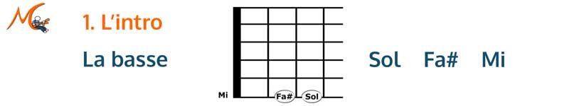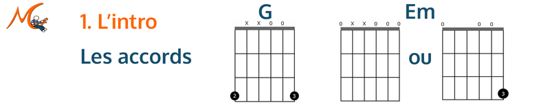 L'intro fait 4 mesures et ne comprend que 2 accords simples : elle est donc abordable même pour un guitariste débutant. Elle se joue en arpège, c'est-à- dire que les notes de l'accord sont jouées une à une.