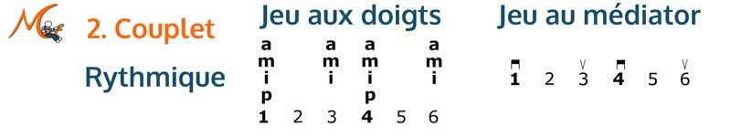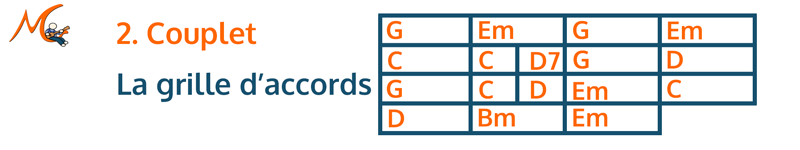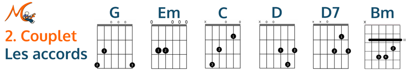 L'accompagnement des couplets est un peu plus difficile pour la main gauche, notamment à cause de l'accord barré. Si vous ne savez pas encore le faire, je vous indique 2 solutions de secours. Pour la main droite, c'est assez facile, surtout si vous jouez en accords brossés.