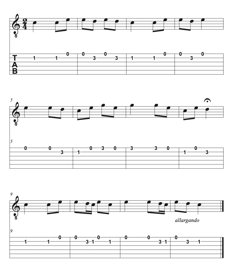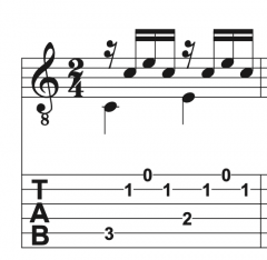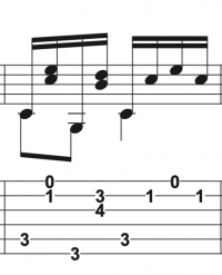 Premier temps : le pouce joue la basse, puis index et majeur jouent ensemble.L'index joue la 2ème corde, le majeur la première.