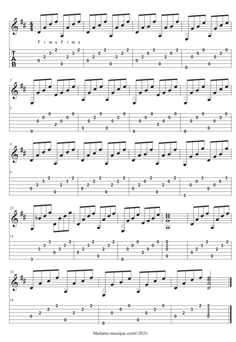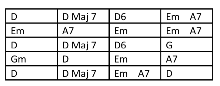 Ecrite à l'origine en Lab majeur (4 bémols à la clé et que des accords barrés), je vous la propose en Ré majeur, sans accords barrés.