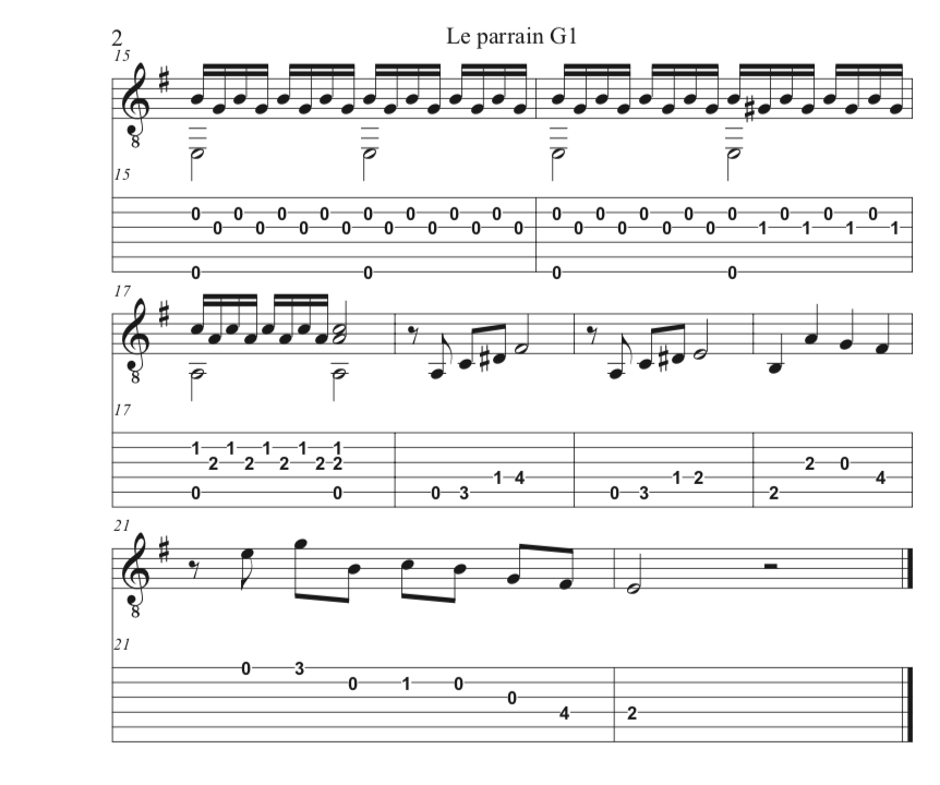 Les 2 guitares se partagent la mélodie à tour de rôle. La guitare 1 demande d'avoir acquis une certaine dextérité de la main droite pour le passage