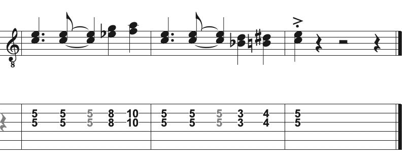 La guitare 2 répète les mêmes 2 mesures, cela s'appelle un ostinato (rythmique et mélodique).